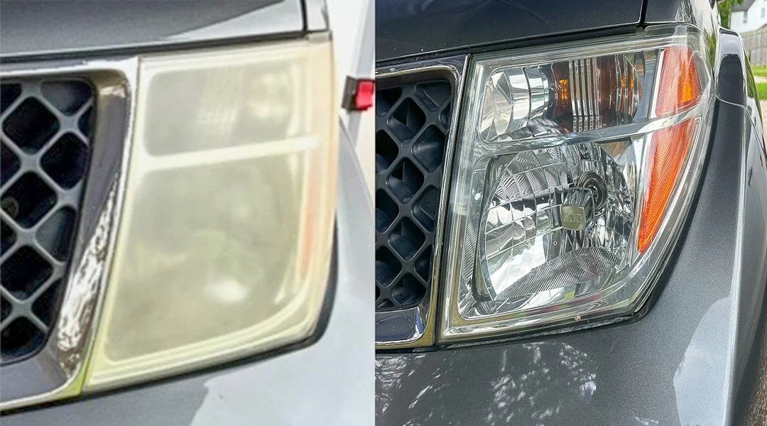 Before and after of headlight restoration performed by GlossFix in Islip town NY